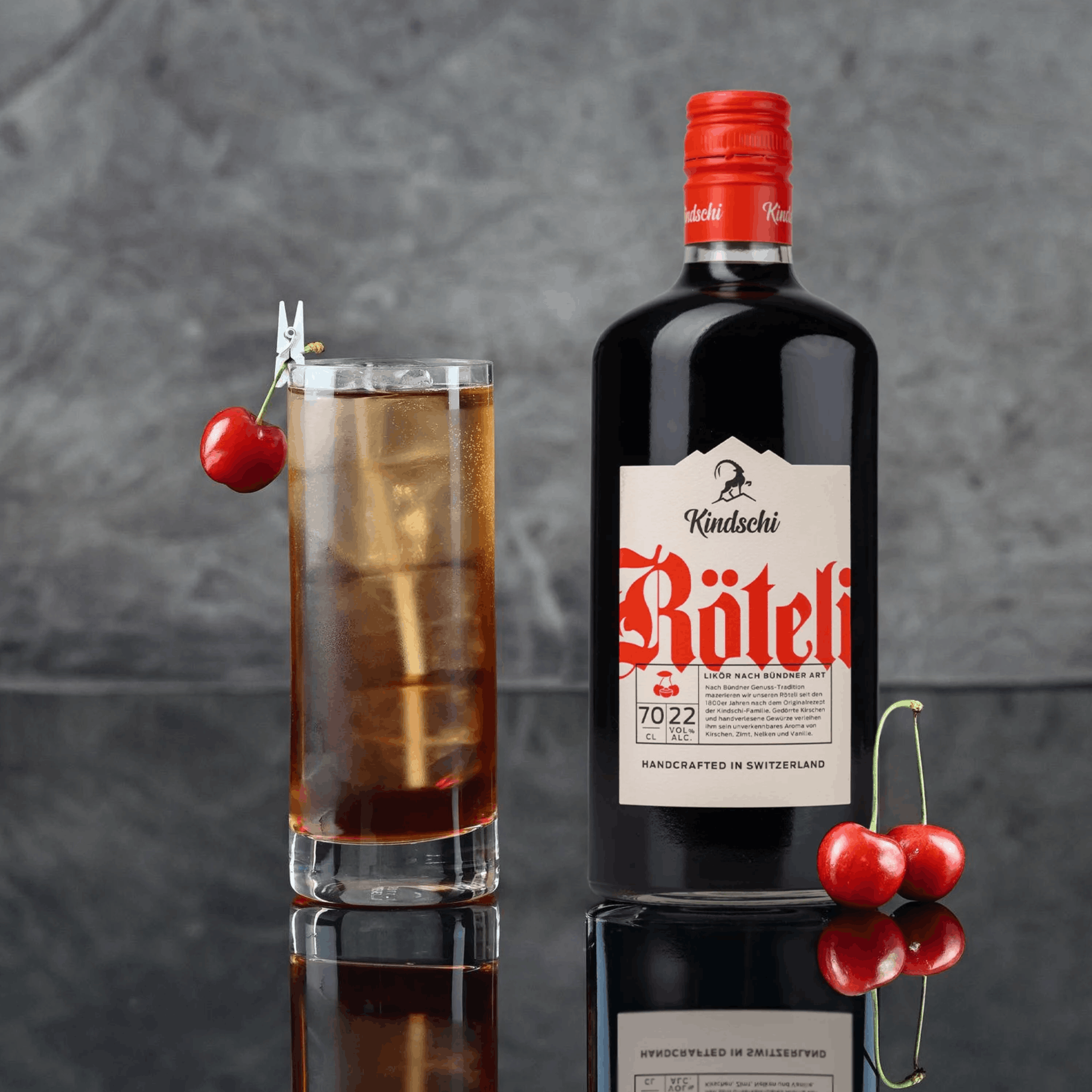 Der Cherry Cooler ist eine moderne Longdrink-Kreation mit regionalem Bezug. Die Grundlage bildet der Röteli – ein traditioneller Kirschlikör aus der Schweiz. Der Röteli hat seinen Ursprung im 19. Jahrhundert, als man in Apotheken und Haushalten alkoholische Kräuter- und Fruchtmischungen zur Konservierung herstellte. Kindschi Röteli, einer der bekanntesten Vertreter dieser Spirituose, steht für authentische Schweizer Brennkunst. In Kombination mit Cola entstand daraus ein unkomplizierter, aber geschmacklich vielschichtiger Longdrink – der Cherry Cooler.